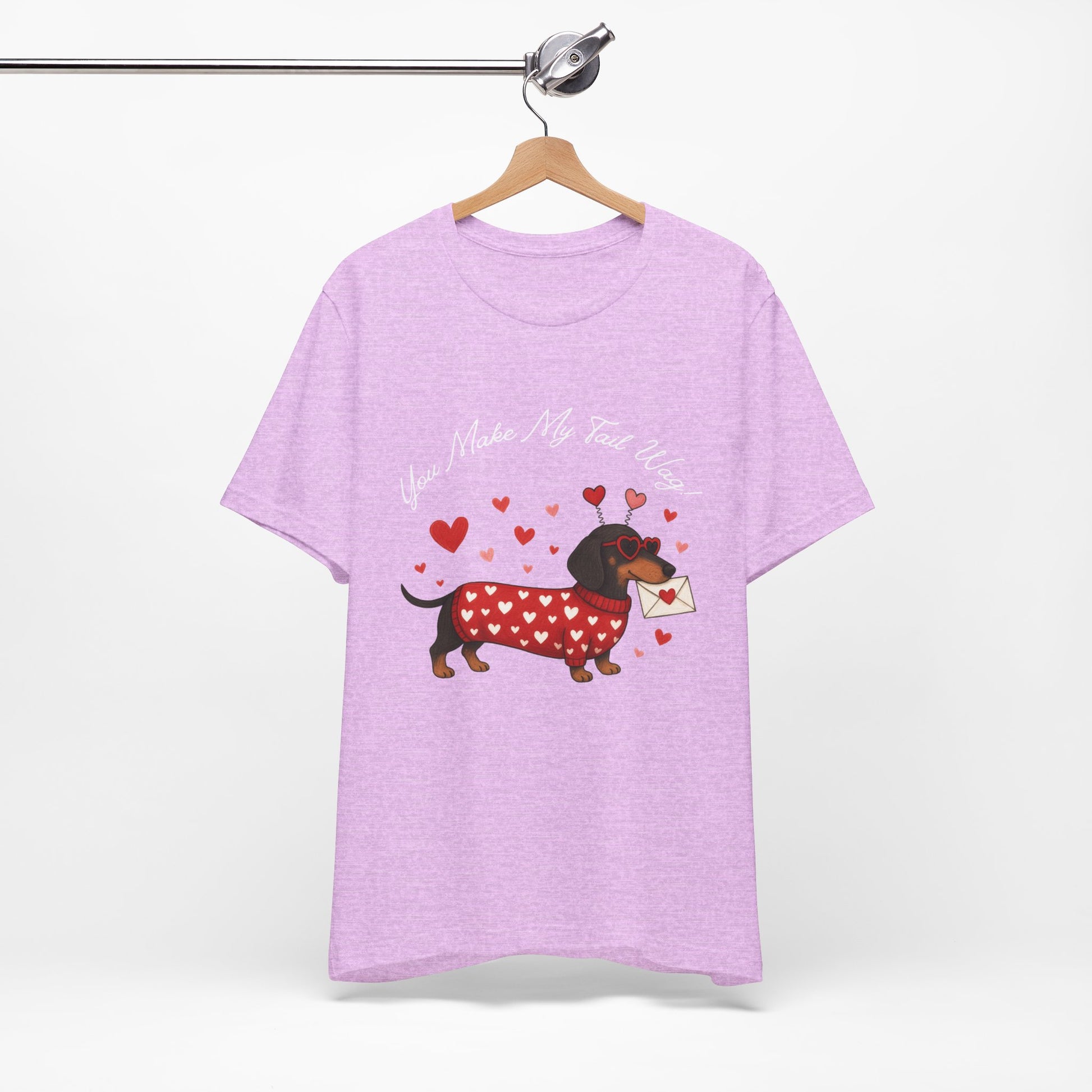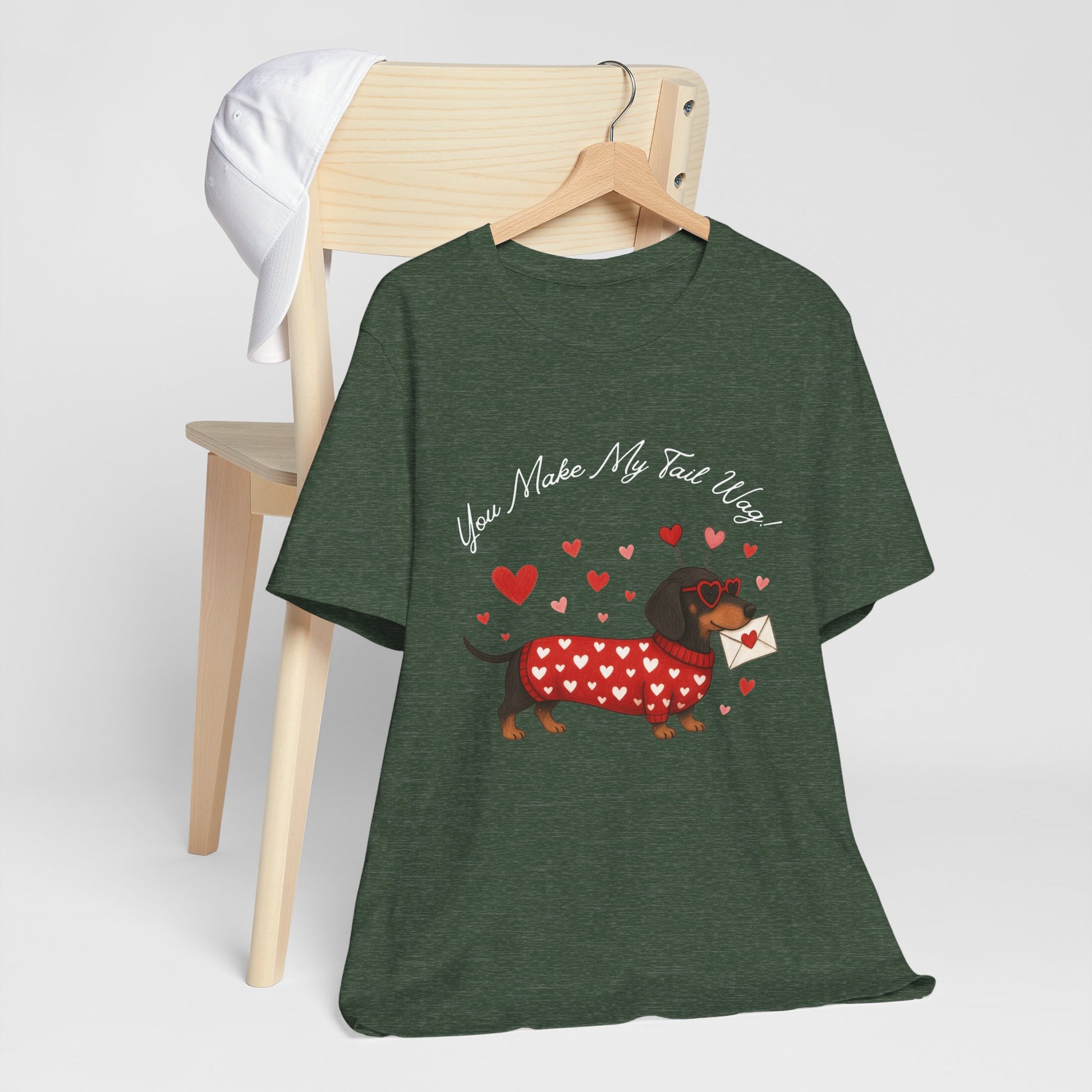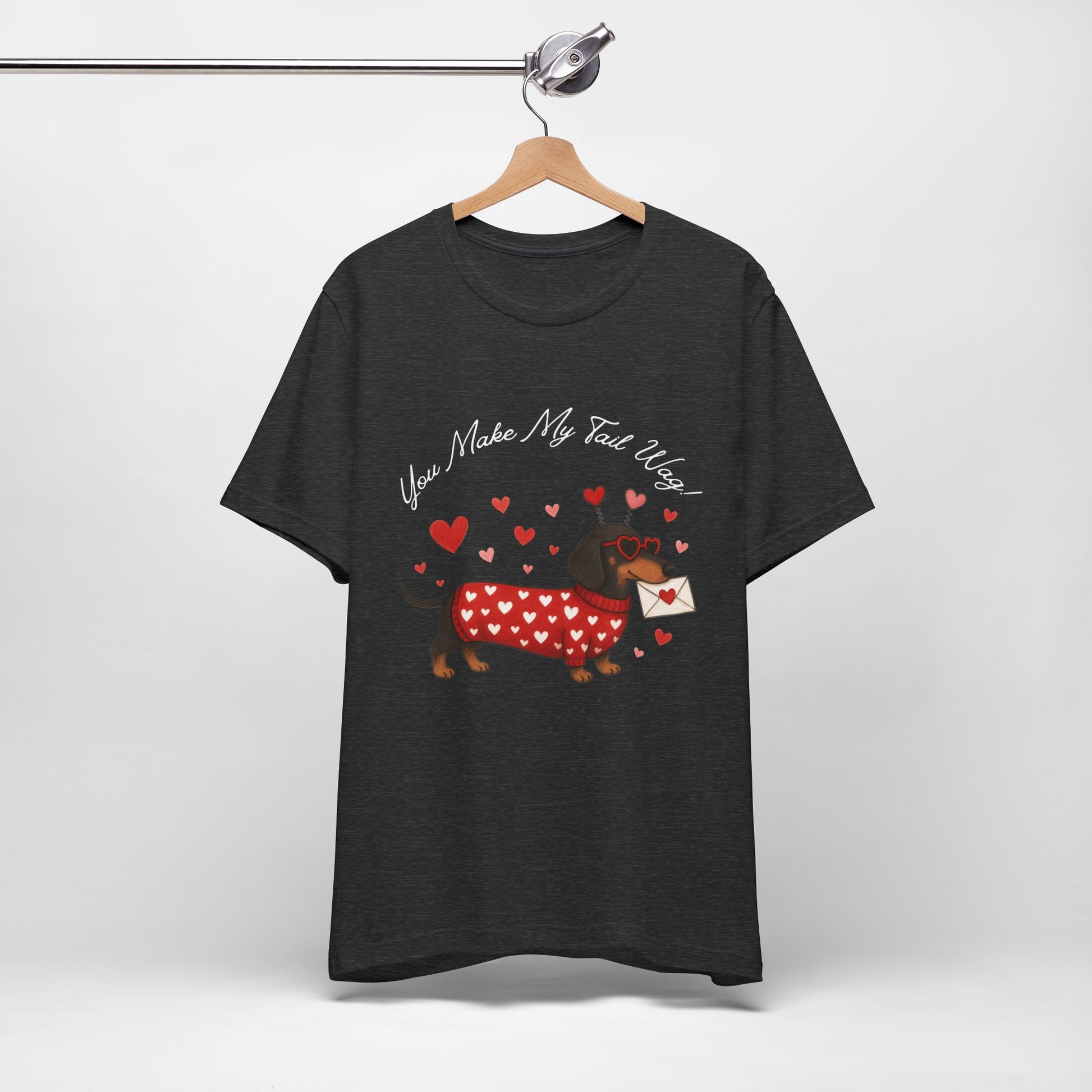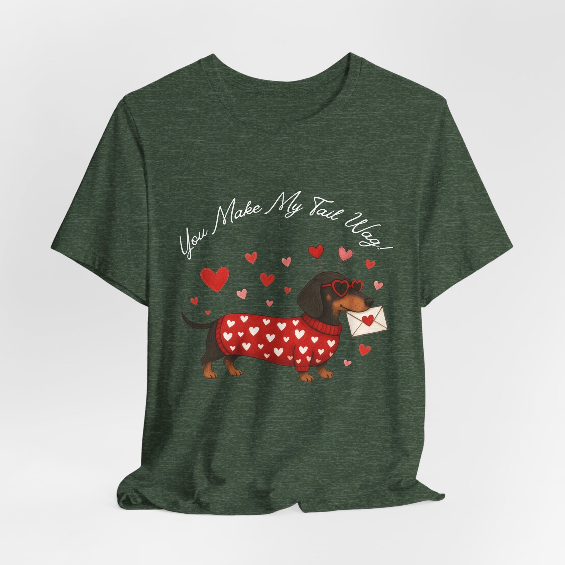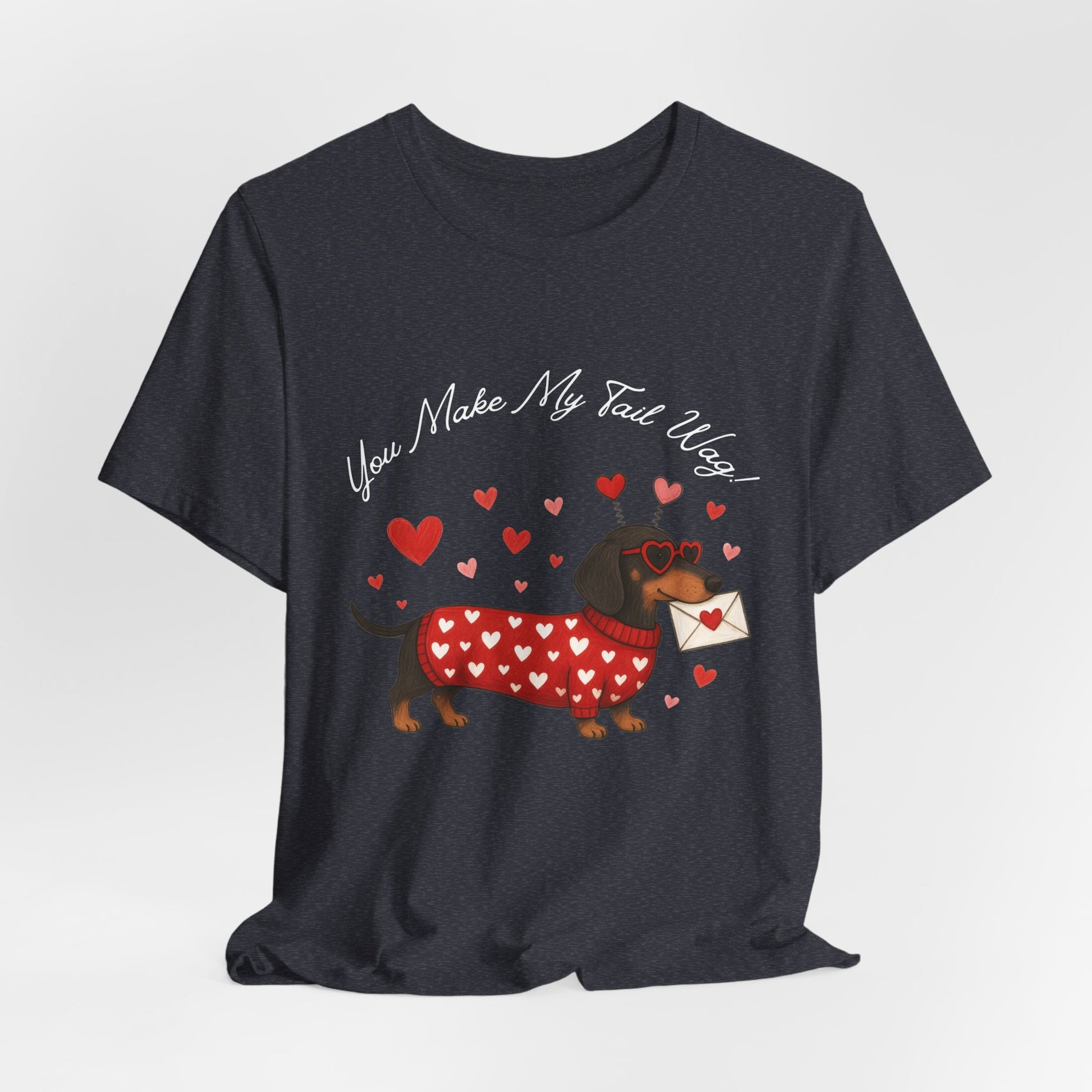 Soft, lightweight tee printed with a whimsical dachshund illustration wearing a heart-patterned sweater and carrying a love letter. The gentle, textured fabric sits close to the body without being tight, making it easy to layer or wear on its own. Subtle heather tones give the design a cozy, hand-drawn look while crisp DTF/DTG printing keeps the artwork sharp and colorful. Small details — ribbed collar, shoulder tape, and side seams — keep the shirt looking neat wash after wash. Ethically made blanks and a tear-away label add comfort and peace of mind for everyday wear.
